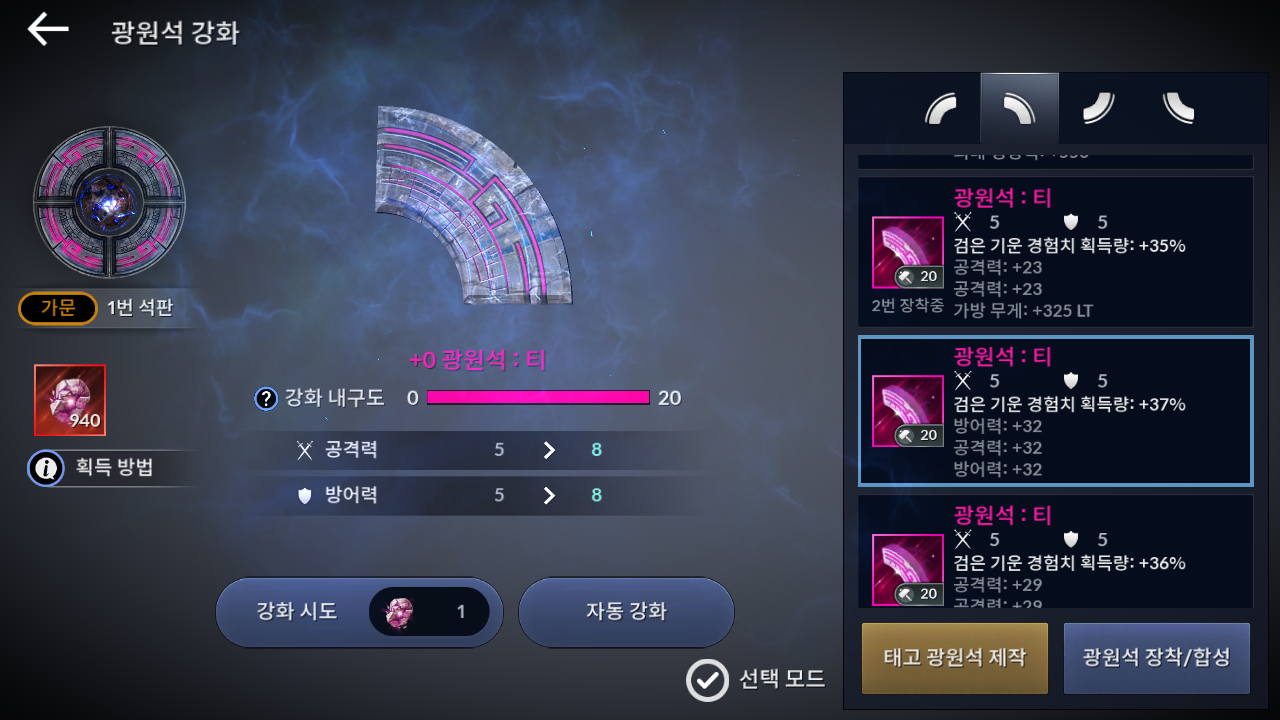 흑정령 메뉴에서 광원석 강화로 들어 갑니다.