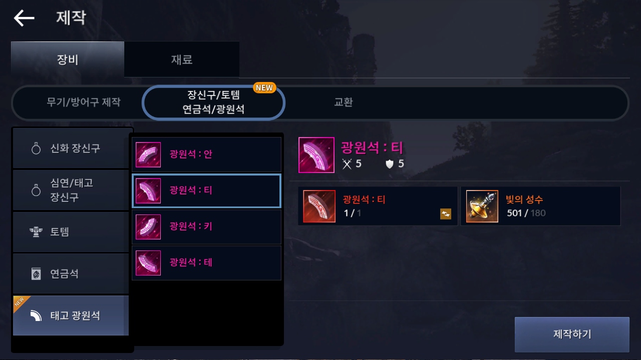 장신구/토템/연금석/광원석 탭에서 제작이 가능 합니다.