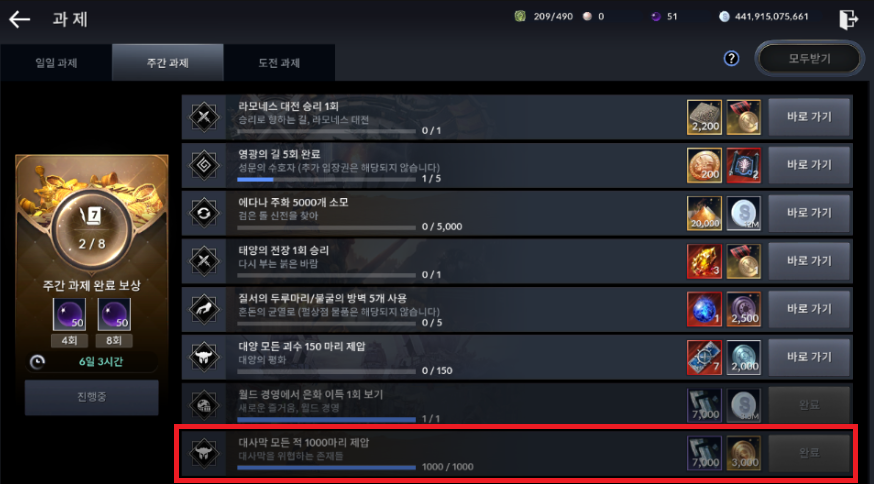 - 용맹의땅 X5배율 한번 진행, 감정 500개도 해야 하니 같이 진행