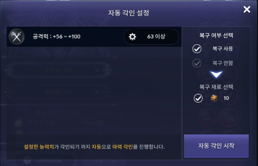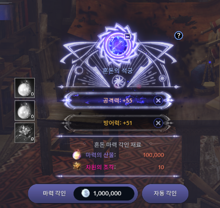 - 마력 각인 실패 시 복구 비용 : 차원의 조각 10개