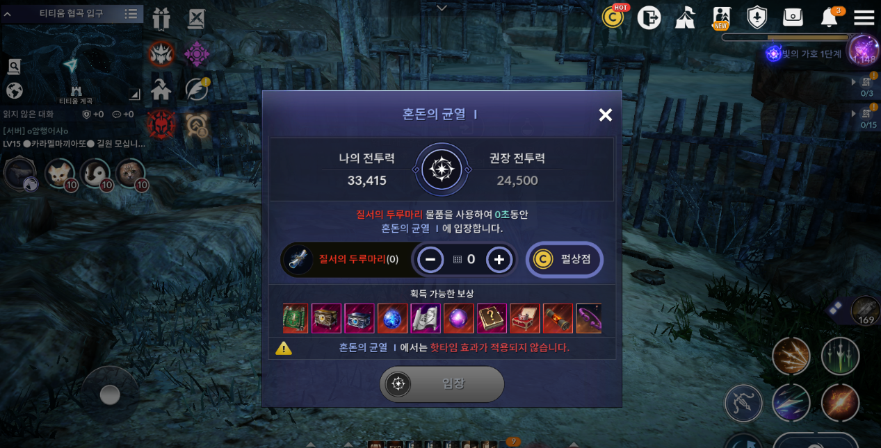 혼돈1 지역은 입장시간이 10시간이다. 비용은 100억