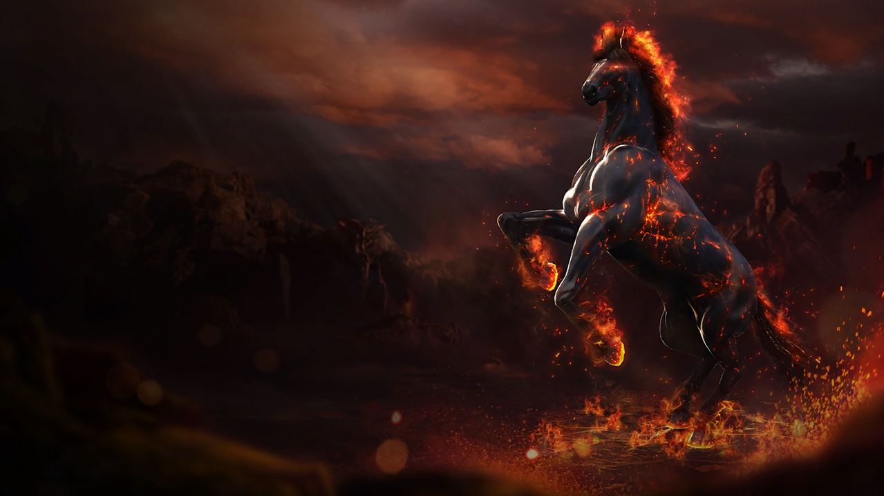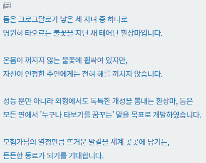 - 둠은 온몸을 휘감고 타오르는 불꽃이 특징을 가진 환상마입니다.
