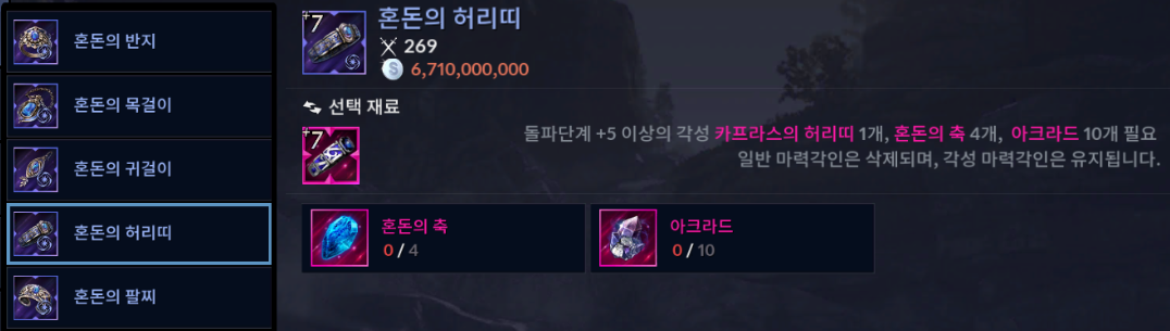 혼돈의 허리띠 재료 +5 이상 각성 카프라스의 허리띠 1개, 혼돈의 축 4개, 아크라드 10개