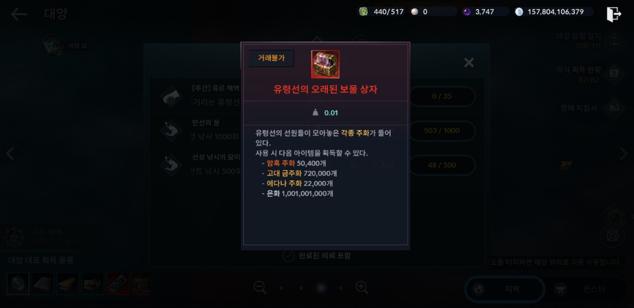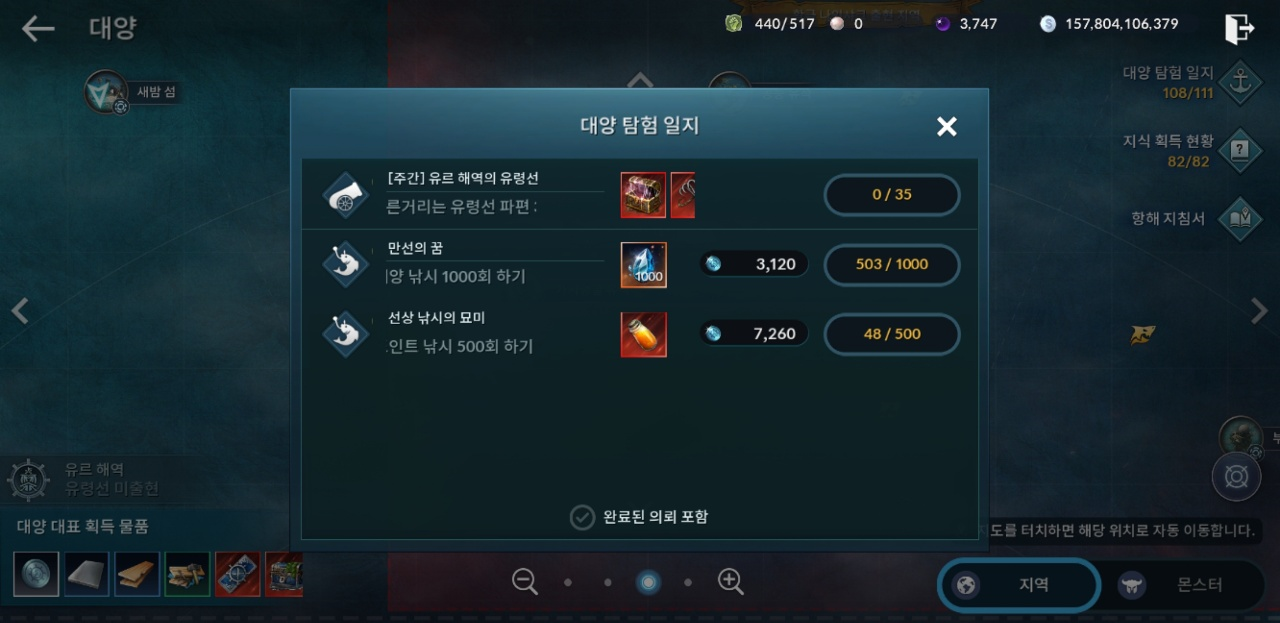 해역 유령선 파편 35개 모으기 진행 퀘스트 있습니다.
