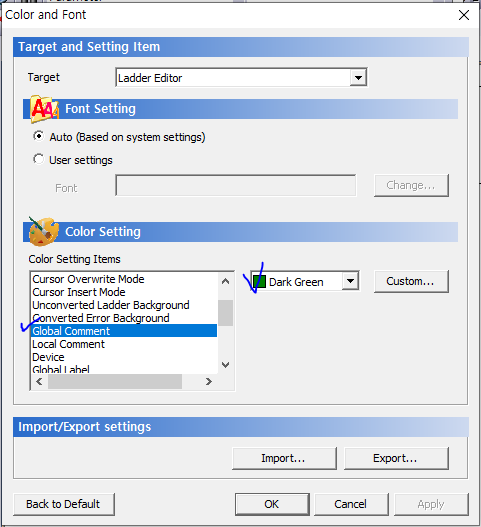 Color Setting Items에서 중간 정도에 Global Comment 클릭하면