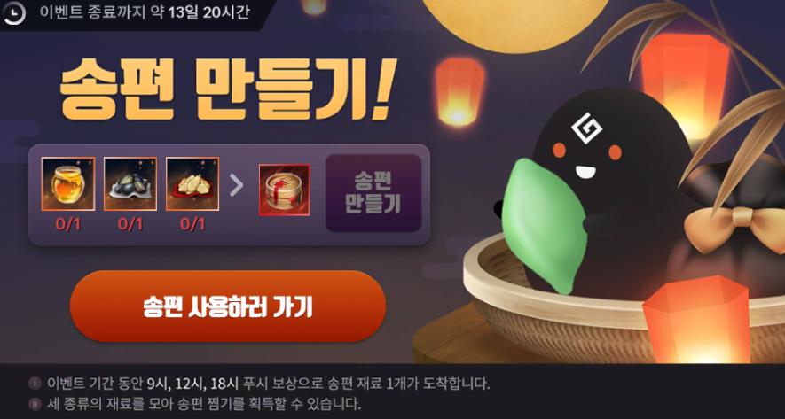 1. 이벤트 기간동안 9시, 12시, 18시 푸시 보상으로 송편 재료 1종 도착