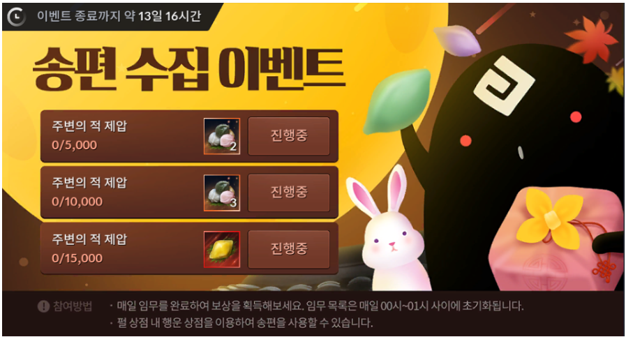 - 15,000마리 주변의 적 제압 시 황금 송편 1개 지급