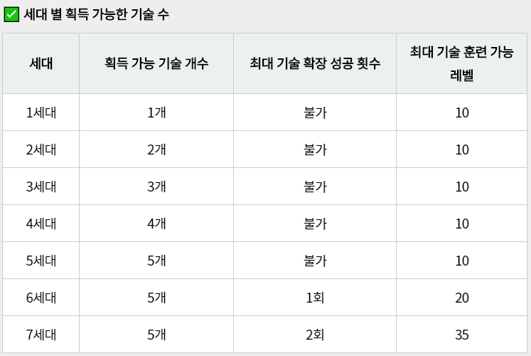 또한 세대 별로 기술별 최대 레벨 까지 있습니다.
