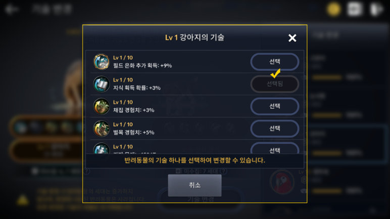 합성시 이미 선택된 반려동물의 기술을 선택 할수 있으며,
