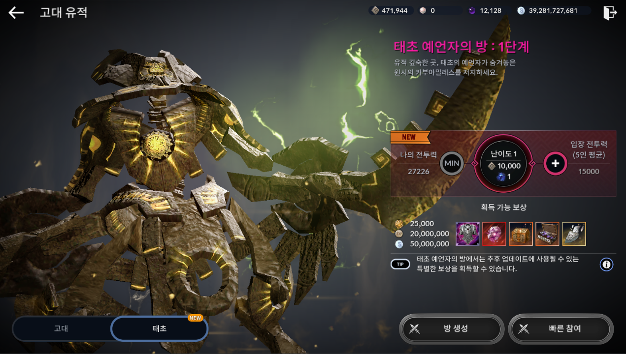 업데이트로 태초 예언자의 방이 등장 했습니다.